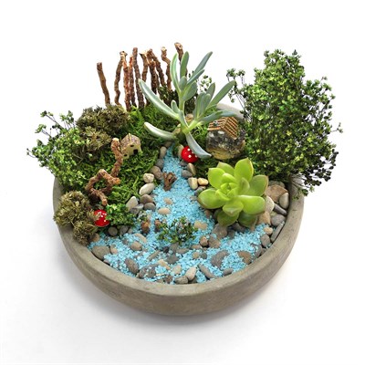 1 ADET BETON SAKSI / 2 ADET MAKET EV / 2 PARÇA YOSUN / 2 ADET SUKULETN (BİTKİ) / 1 PAKET TOPRAK / ÇAKIL / MAVİ KUM / KURUTULMUŞ BİTKİLER |